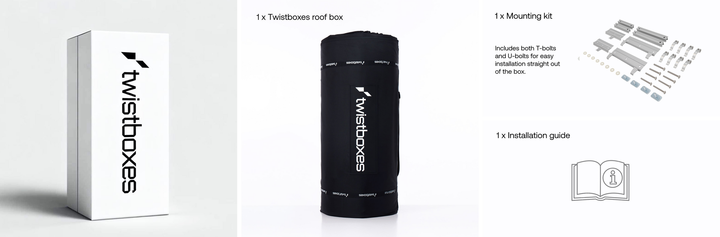 Every Twistbox ships complete and ready to mount. Inside the box: one Twistboxes 520L roof box, one full mounting kit with T-bolt and U-bolt hardware, an adjustable shoulder strap for carrying, internal tie-down strap, and a step-by-step instruction manual. Locks are available separately, everything else is included.